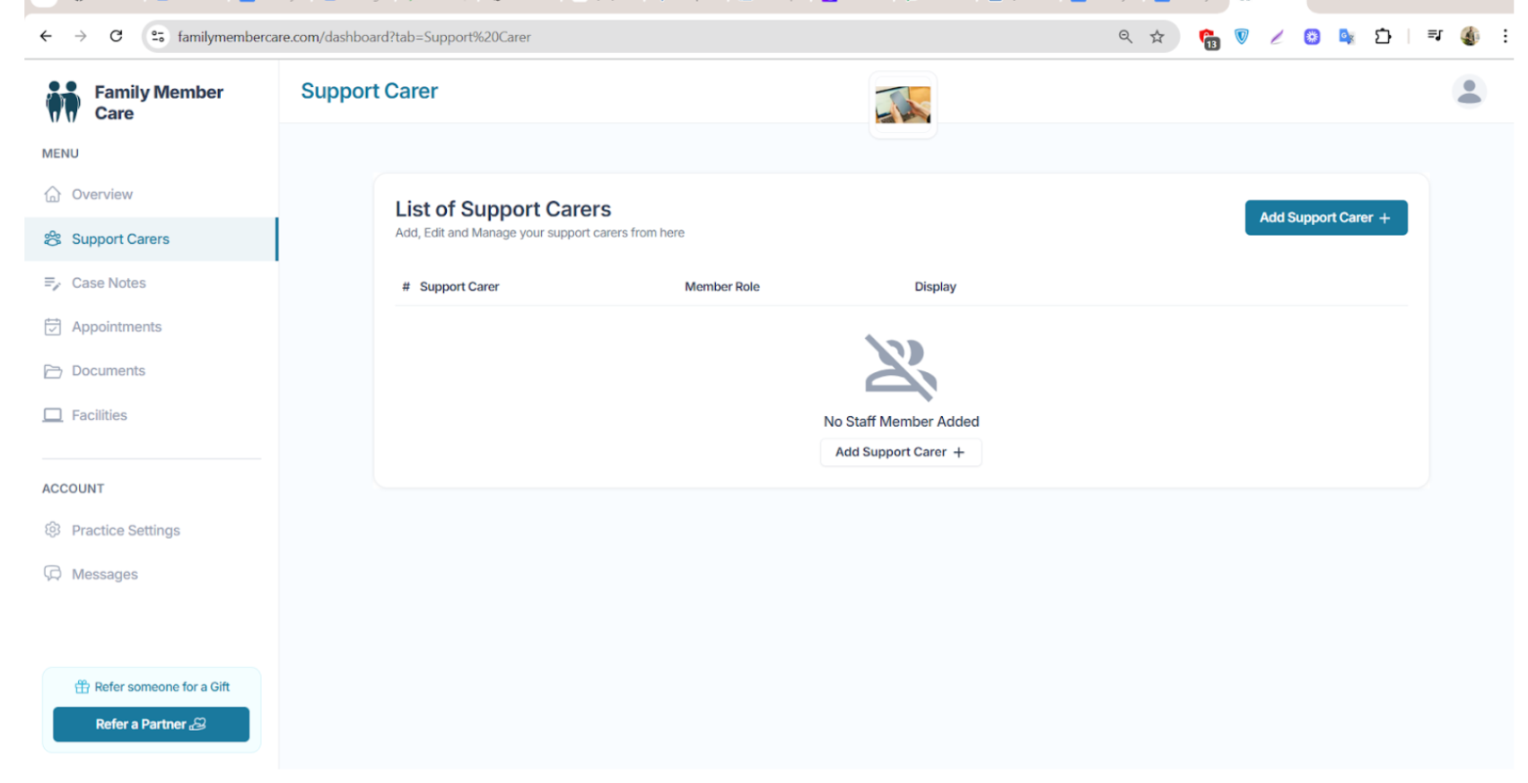 You’ll see a section titled List of Support Carers, which displays all your added staff members.