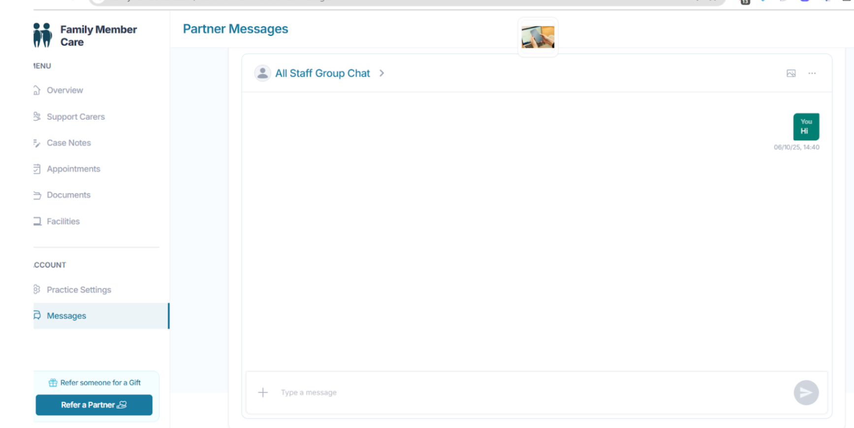 The Messages page allows partners and staff members to communicate within the Family Member Care platform. It provides a simple chat interface for sending and receiving messages in real time, helping teams stay connected and share important updates.