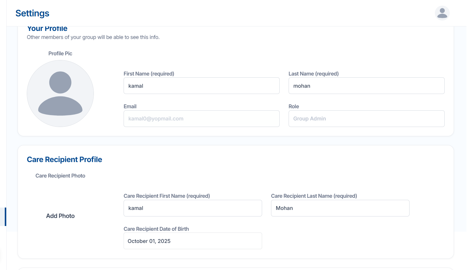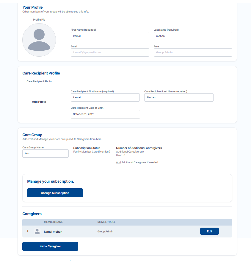 This page allows users to view and manage their personal profile, care recipient information, and care group details.