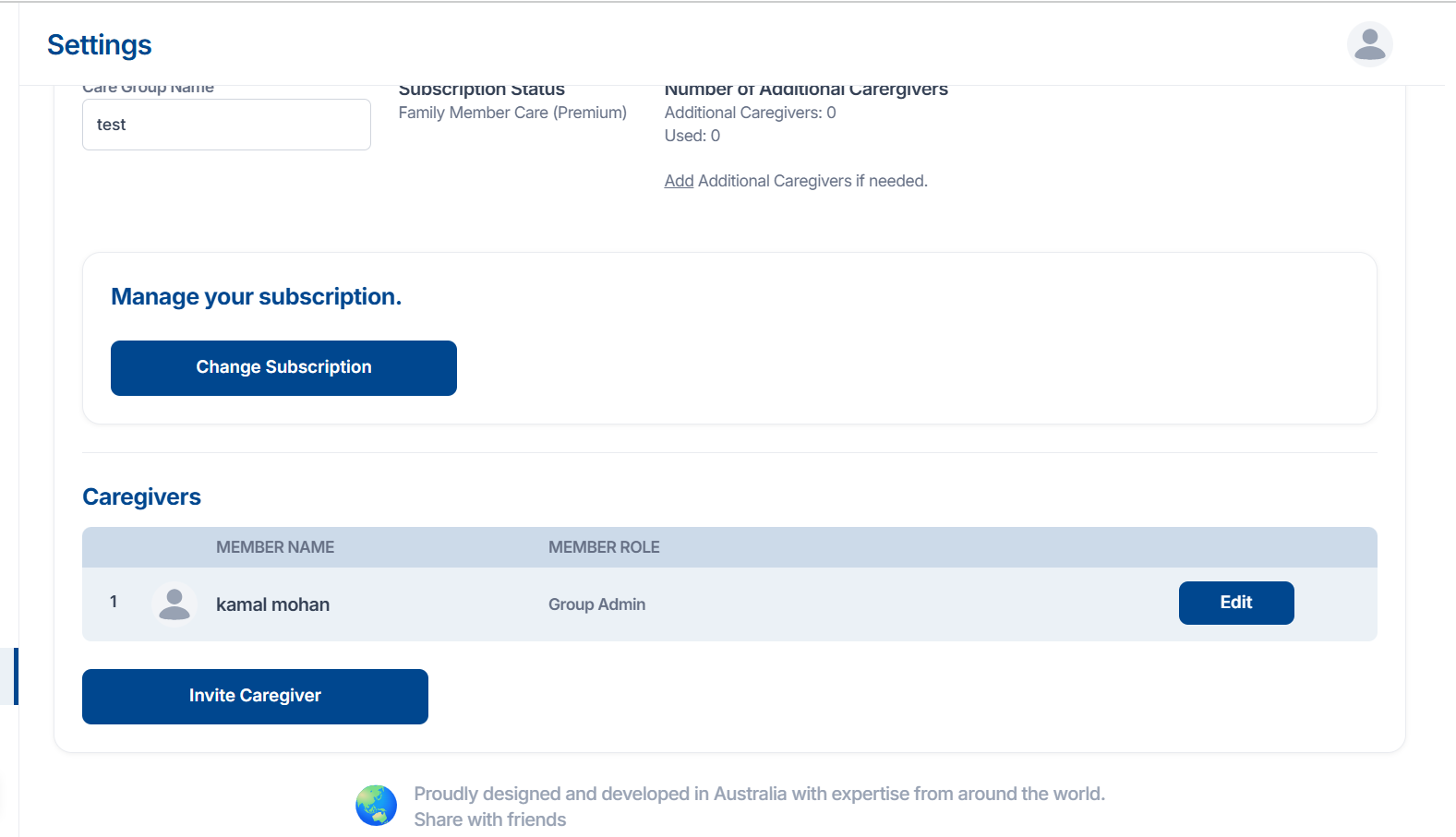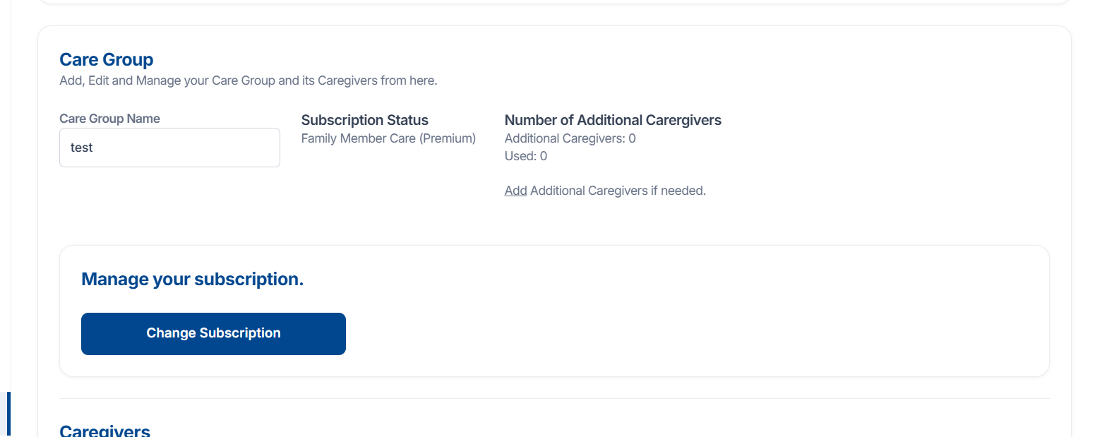 You can see the care group name, current subscription status (for example, Family Member Care – Premium), and the number of additional caregivers allowed and used.