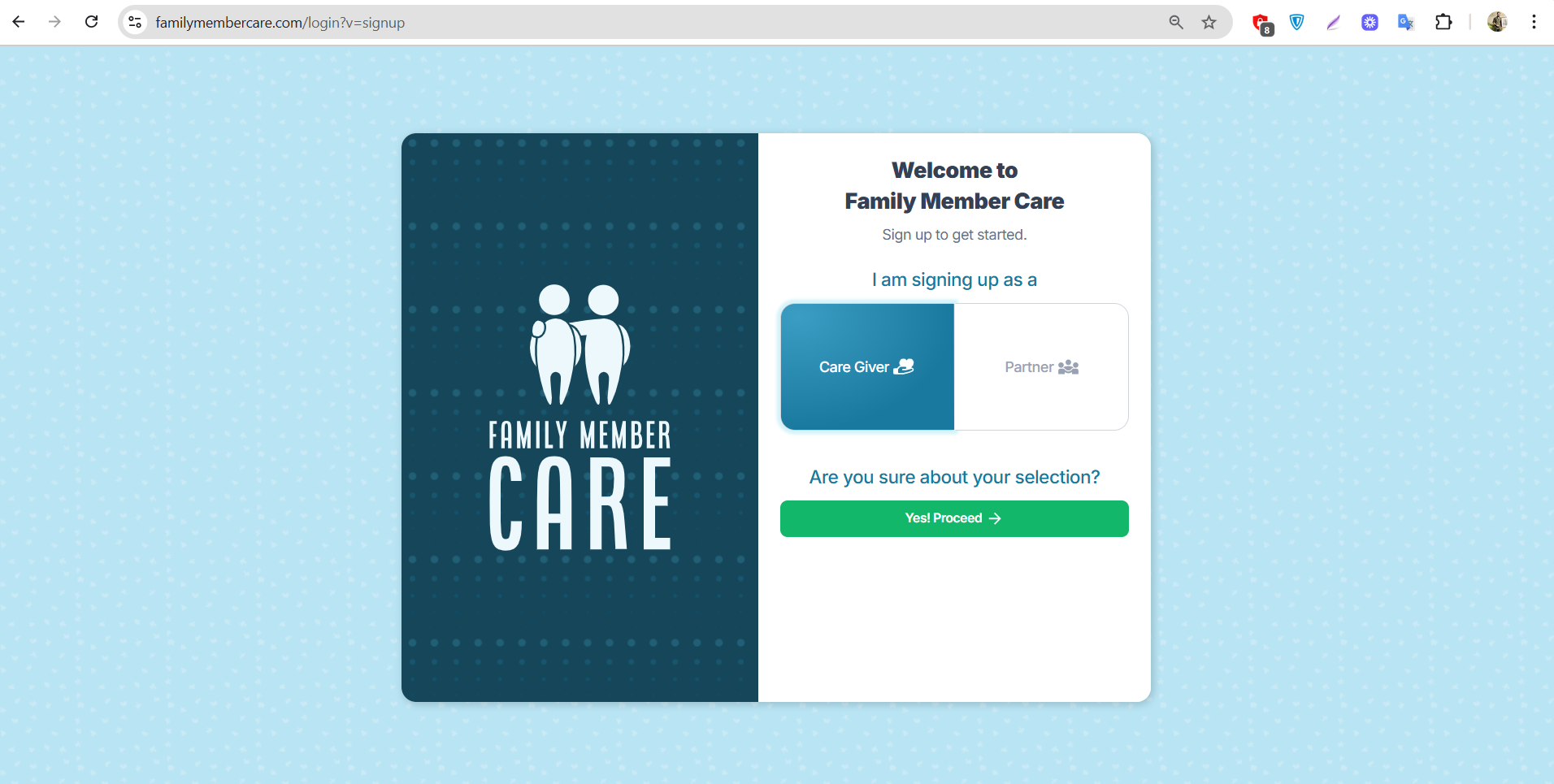 After choosing the Care Giver role, click the green button that says “Yes! Proceed →”